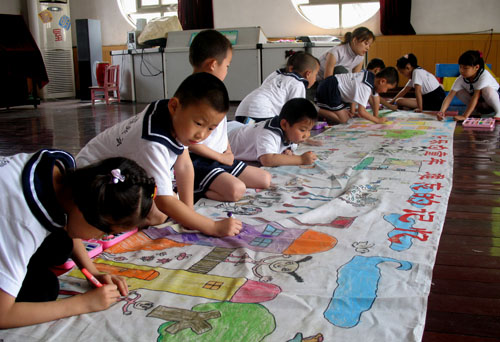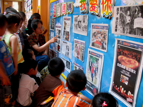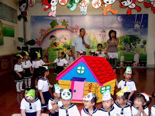 1 、《爱在人间》 由于5月12日汶川大地震的发生,使全国人民陷入悲痛之中。面对这突然而来的灾难,我园积极的组织募捐献爱心活动,并且抓住这次沉痛的时机,给孩子进行一场深刻爱的教育。图为老师正通过图片给孩子讲解,让孩子学会如何去传递心中的爱,如何把爱泛化到社会的各个角落,让爱充满人间!