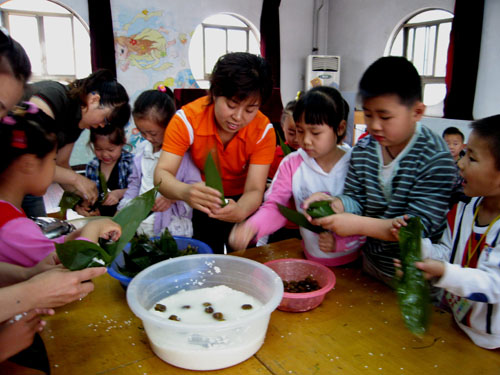 5、《粽子的情愫》 老师们积极利用传统节日"端午节"开展教育活动。通过听故事,包粽子、吃粽子、 背古诗等,让幼儿了解端午节的来历、民间过端午节的风俗习惯,了解了中国传统文化的内涵和风俗形式。你看图中老师正教孩子们包粽子呢!