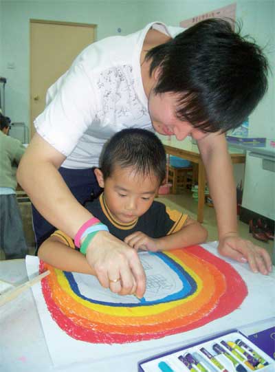 圆圆跪在木头凳子上,从盒子里拿出一个蜡笔,在一张纸上画着。他的美术老师崔本通问他:“你是在画你脑袋里你最喜欢的季节吗?”作为一个美术教师,崔老师从没有详细的设计他的课程。通常,他就是让他的孩子画出他们想画的画面,只要与他所给出的主题相关就行。“耶!”孩子们点点头。“好的!开始吧!”很快地,在一张长方形的纸上就出现了一副雪景。崔老师说:“孩子们有着超常的创新能力,我们不要限制他们,我更多的是引导而不是强迫孩子进入美术的世界”崔老师对于教学的创新使他的美术课在幼儿园非常的受欢迎。